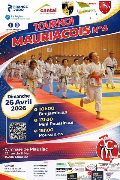 4e Tournoi de judo mauriacois : 10h benjamins - 13h30 mini poussins - 15h poussins. Tournoi ouvert au public pour venir encourager les jeunes judokas.